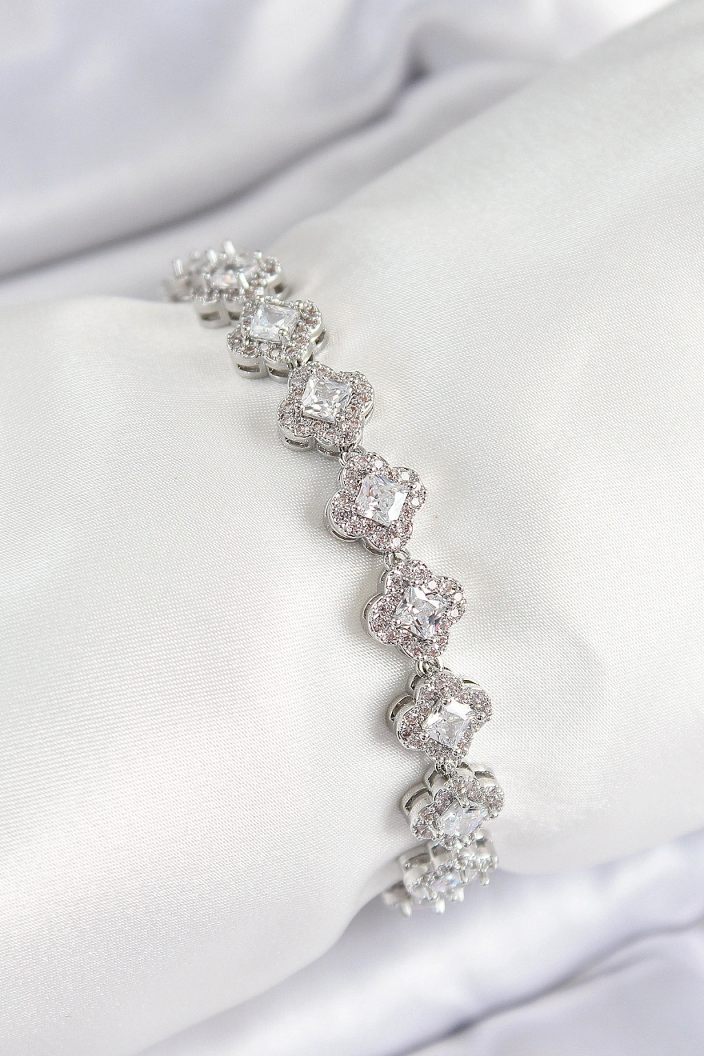 Pirinç Zirkon Taşlı Yonca Baget Model Gümüş Renk VIP Seri Kadın Bileklik