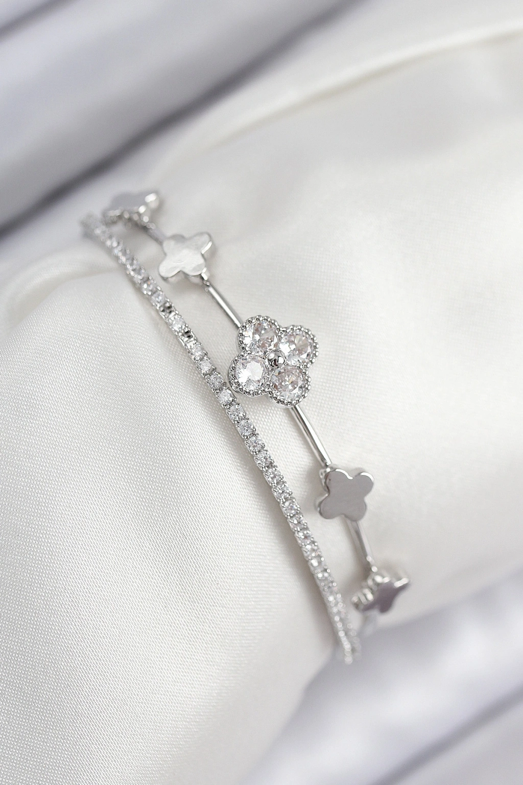Pirinç Zirkon Taşlı Yonca Model Gümüş Renk Kadın Bileklik