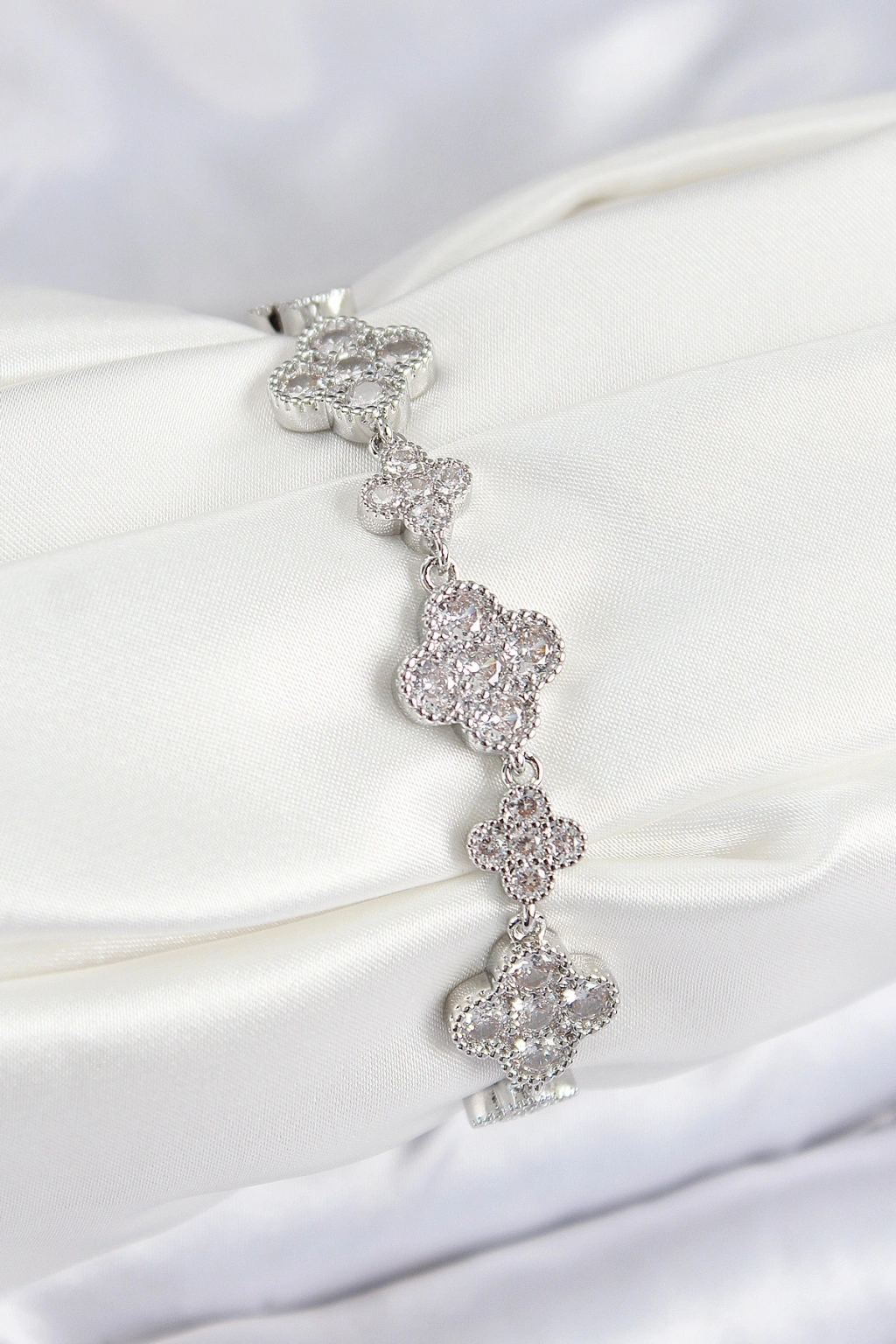 Pirinç Zirkon Taşlı Yonca Model Gümüş Renk VIP Seri Kadın Bileklik