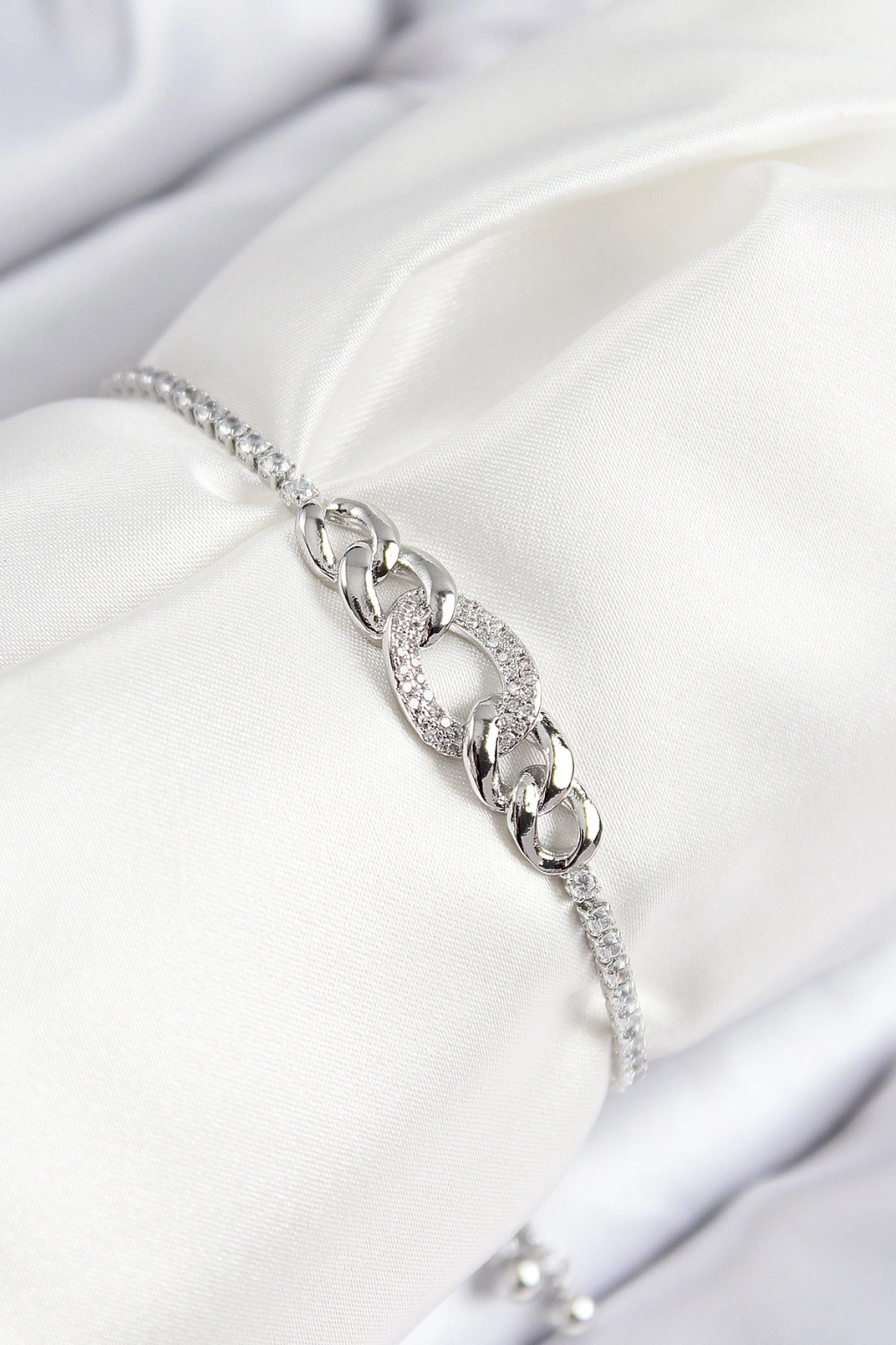 Pirinç Zirkon Taşlı Zincir Model Gümüş Renk Asansörlü Kadın Bileklik