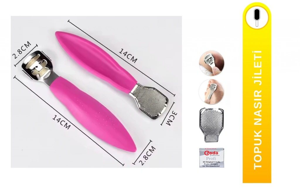 Profesyonel Nasır Raspası ve Paslanmaz Topuk Rendesi Ayak Bakım Seti Pürüzsüz Adımlar: Profesyonel Nasır ve Topuk Bakım Seti Nasır Raspası ve Topuk Rendesi Seti, ayak sağlığınız ve estetiği için evde profesyonel bakım yapmanızı sağlar. Sertleşmiş deri, nasır ve ölü derileri saniyeler içinde temizleyerek ayaklarınızı bebeksi bir yumuşaklığa kuşturur. Öne Çıkan Özellikler Etkili Temizlik: Özel "Corn Plane" bıçak yapısı sayesinde en inatçı nasırları ve sertleşmiş derileri zaetsizce temizler. Çift Fonksiyonlu Tasarım: Set içerisinde hem hassas törpüleme için metal rende başlığı hem de derinlemesine temizlik için raspa mekanizması bulunur. Ergonomik Tutuş: Kaymaz ve hafif gövde yapısı ile güvenli ve kolay bir kullanım sunar. Hijyenik ve Dalı: Paslanmaz çelik aparatları sayesinde uzun ömürlüdür ve kolayca temizlenebilir. Neden Bu Bakım Setini Tercih Etmelisiniz? Ayak tabanındaki ölü derileri temizlemek sadece es değil, aynı zamanda ayak sağlığı için de kritiktir. Bu set, düzenli kullanımda çatlak oluşumunu önler ve pedikür maliyetlerinizi düşürür. Ürün Detayları: Paket İçeriği: 1 adet ergonomik gövde, değiştirilebilir rende başlığı ve 10 Adet yedek bıçaklar. Kullanım Alanı: Topuklar, ayak tabanı ve parmak kenarlarındaki sertleşmiş dokular. Sonuç: Pürüzsüz, sağlıklı ve bakımlı ayaklar.