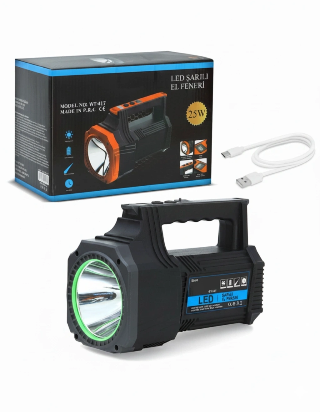 Şarjlı Dev Boy El Feneri 25W Süper Parlak LED El Lambası Kamp, Av ve Güvenlik İçin İdeal Karanlıkta hiçbir detayı kaçırmayın! 25W gücündeki şarjlı dev boy LED el feneri, yüksek parlaklık ve uzun menzil performansıyla geceyi gündüze çevirir. Güçlü LED ampul teknolojisi sayesinde geniş alanları aydınlatabilir, kamp, avcılık, devriye ve acil durumlarda güvenilir bir ışık kaynağı olarak kullanılabilir. Dalı dış gövdesi darbeye karşı koruma sağlar, ergonomik tasarımı sayesinde elinizde rahat bir tutuş sunar. Şarjlı bataryasıyla uzun süreli kullanım iânı verir; enerji bittiğinde ise kolayca tekrar şarj edilebilir. Bu el feneri, profesyonel kullanım isteyenler için olduğu kadar, evde, arabada veya doğa gezilerinde de mükemmel bir yardımcıdır. Gücünü, dalılığını ve ışığını hisset! Paket İçeriği : 1 Adet Şarjlı Dev Boy El Feneri 25W Süper Parlak LED El Lambası Kamp, Av ve Güvenlik İçin İdeal 1 Adet Şarj Kablosu