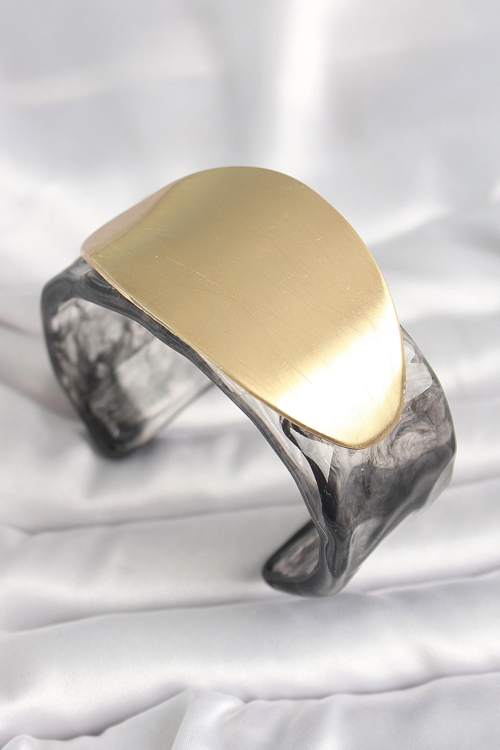 Siyah Mermer Desen Akrilik Plastik Gold Oval Plaka Model Vintage Kadın Bilezik