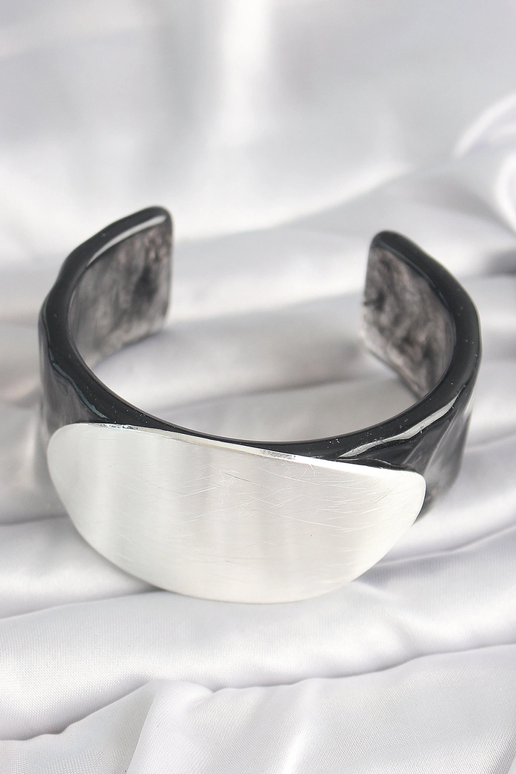 Siyah Mermer Desen Akrilik Plastik Gümüş Oval Plaka Model Vintage Kadın Bilezik