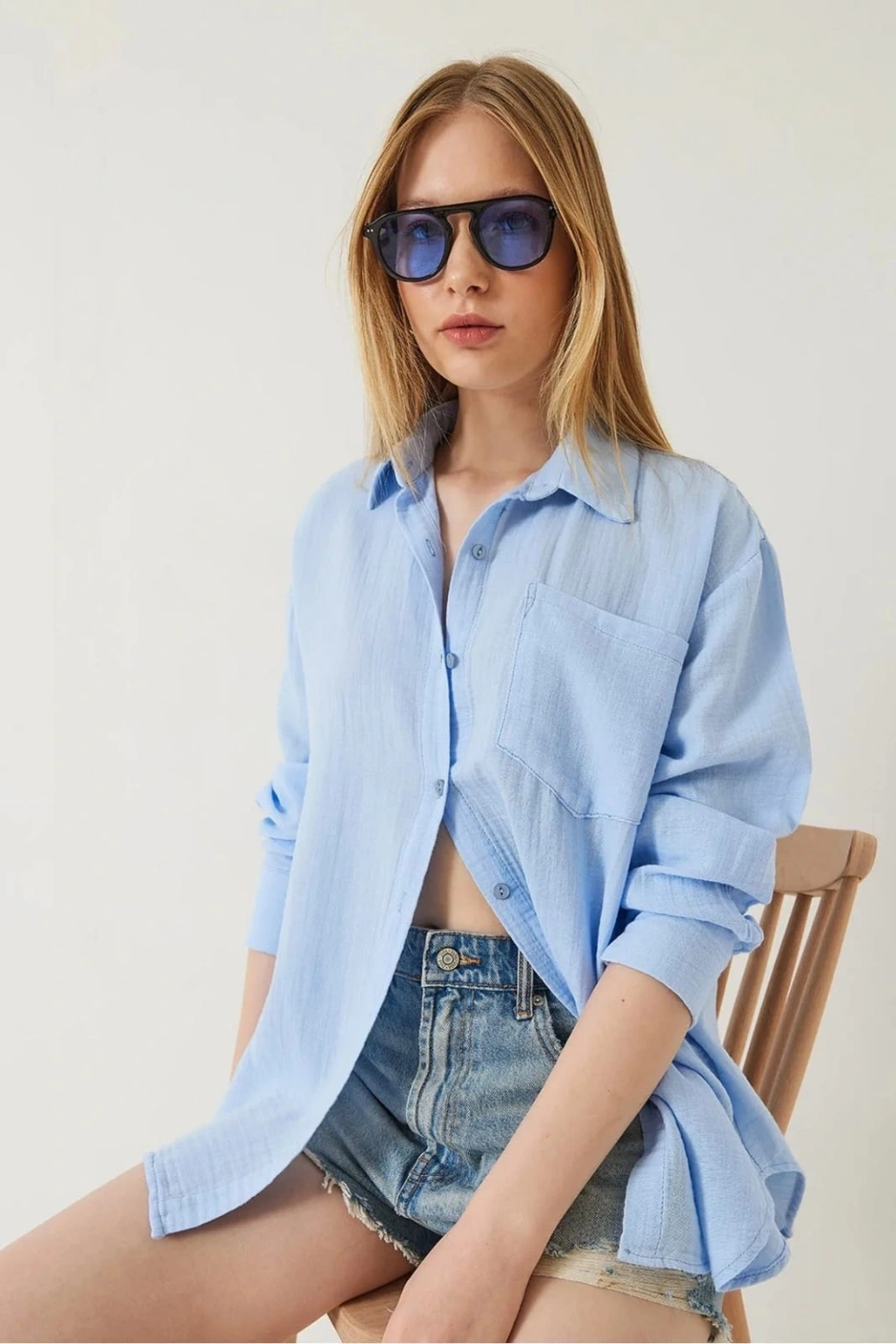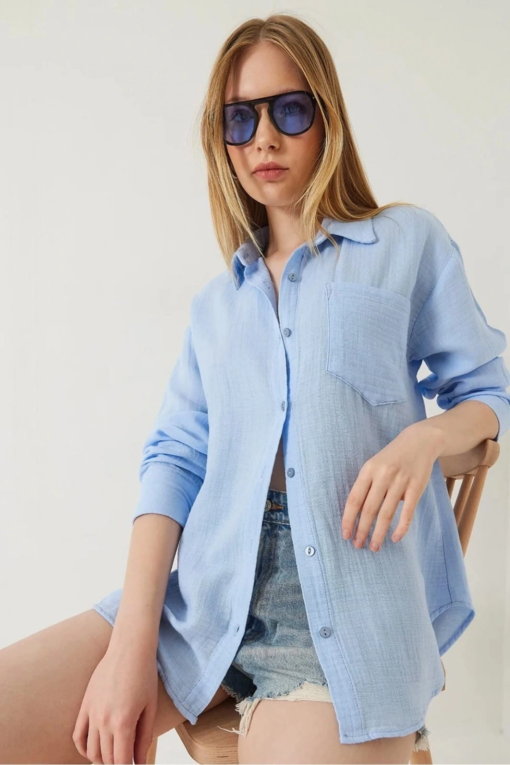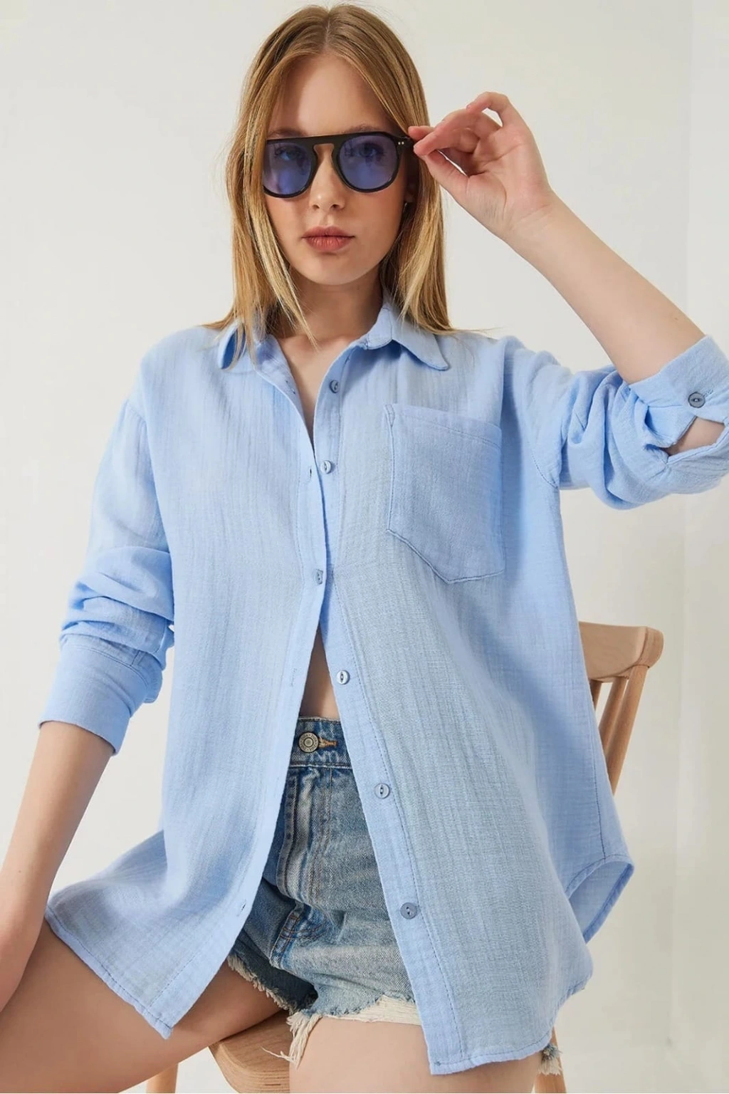 Tek cepli müslin gömlek mavi pt--Bu mavi tek cepli müslin gömlek, gardırobunuzun vazgeçilmezi olmaya aday! Zarif tasarımı ve rahat kesimiyle şıklığı ve konforu bir arada sunar. Ürün Özellikleri: Renk: Mavi Kumaş: Müslin Kol Tipi: Uzun Kollu Detay: Tek Cep Kategori: Kadın Giyim > Gömlek Bu şık gömleği ofis kombinlerinizde, günlük hayatta veya özel davetlerde rahatlıkla tercih edebilirsiniz. Farklı tarzınızla her ortama uyum sağlayacak!