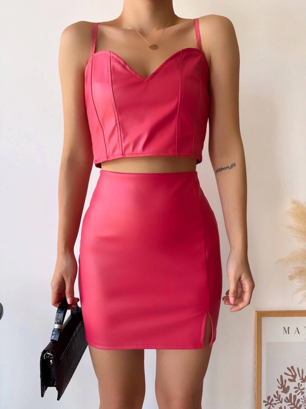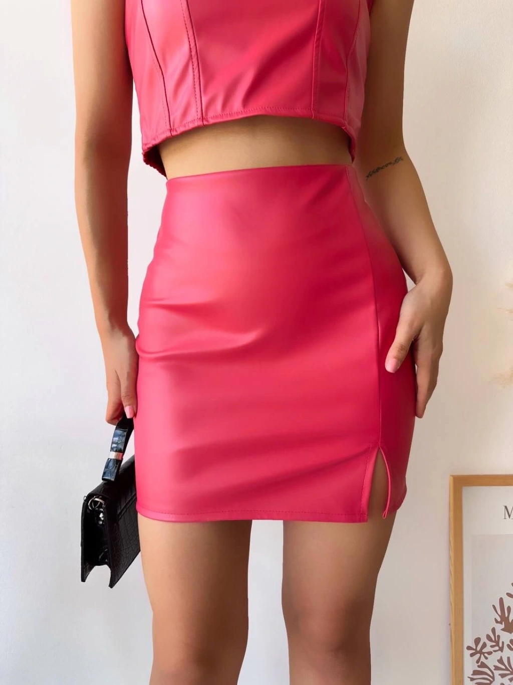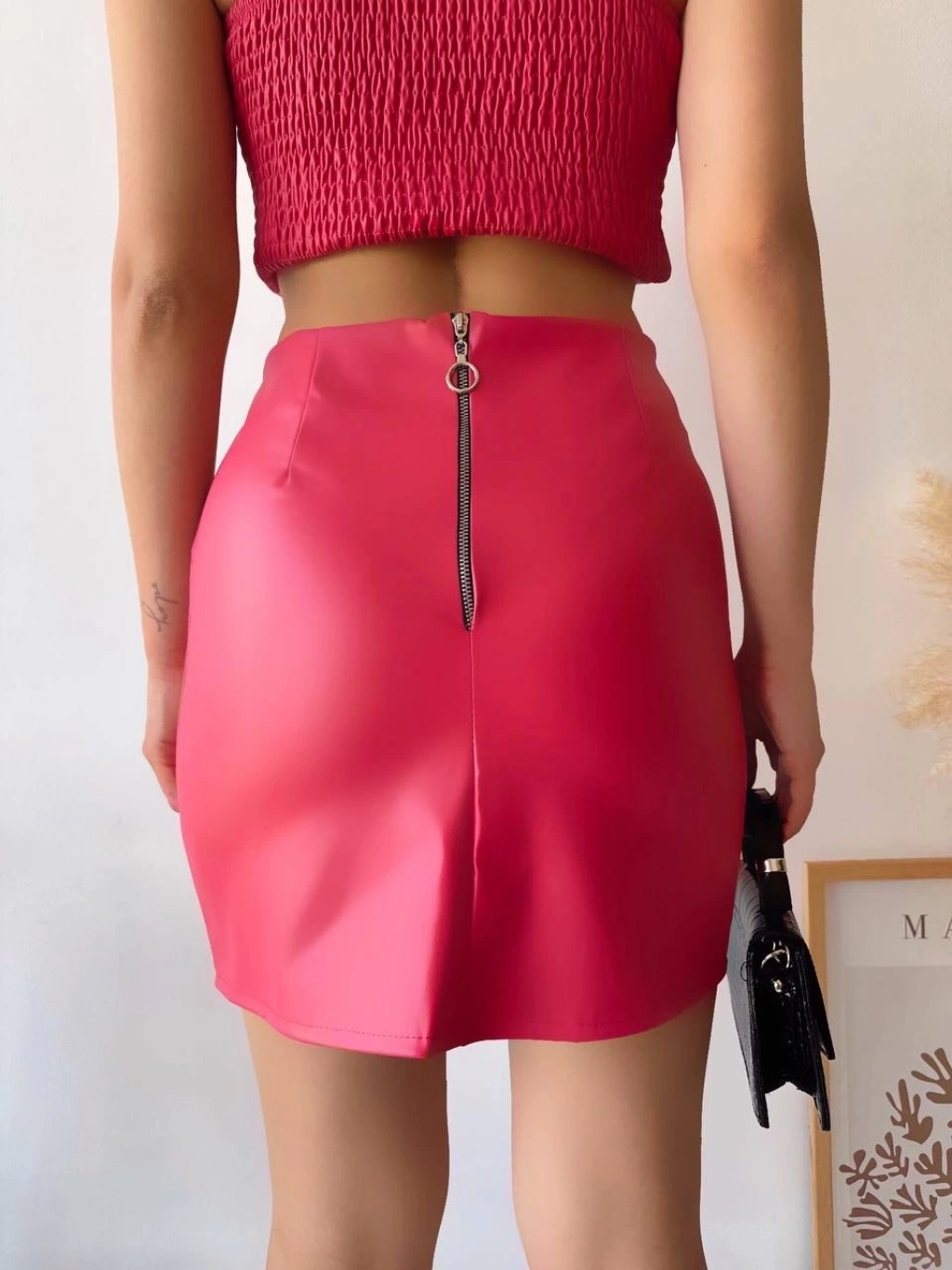 Tek yırtmaçlı arkadan fermuarlı deri etek fuşya --Şıklığı ve zarafeti bir arada sunan Tek Yırtmaçlı Arkadan Fermuarlı Deri Etek Fuşya , gardırobunuzun vazgeçilmez parçalarından biri olmaya aday! İşte bu eteğin öne çıkan özellikleri: Yüksek kaliteli deri malzemeden üretilmiştir. Modern ve şık tasarımı ile her kombinle uyum sağlar. Bel kısmında yer alan yırtmaç detayı, hareket özgürlüğü sunar. Arkadan fermuarlı yapısıyla kolayca giyip çıkarılabilir. Fuşya rengi ile dikkat çeker ve tarzınızı yansıtır. Bu muhteşem deri eteği şimdi satın alarak gardırobunuza şıklık katın!