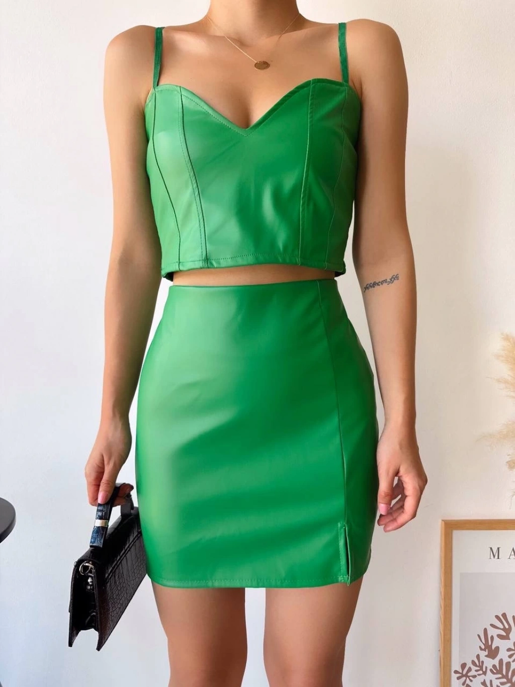 Tek yırtmaçlı arkadan fermuarlı deri etek yeşil --Şıklık ve modern tasarımı bir arada sunan Tek Yırtmaçlı Arkadan Fermuarlı Deri Etek Yeşil , gardırobunuzun vazgeçilmezi olmaya aday! Ürün detayları: Yeşil renk ve deri kumaş ile göz alıcı bir şıklık Bel bölgesindeki yırtmaç detayı ile farklı bir hava Arkadan fermuarlı tasarımıyla kolayca giyip çıkarabilirsiniz Yüksek kaliteli malzeme ve dikkatli işçilik Bu eteği şık bluzlar veya gömlekler ile kombinleyerek günlük hayatta veya özel davetlerde şıklığınızı konuşturabilirsiniz. KADIN GİYİM kategorisinde yer alan bu eteği hemen sepetinize ekleyin!