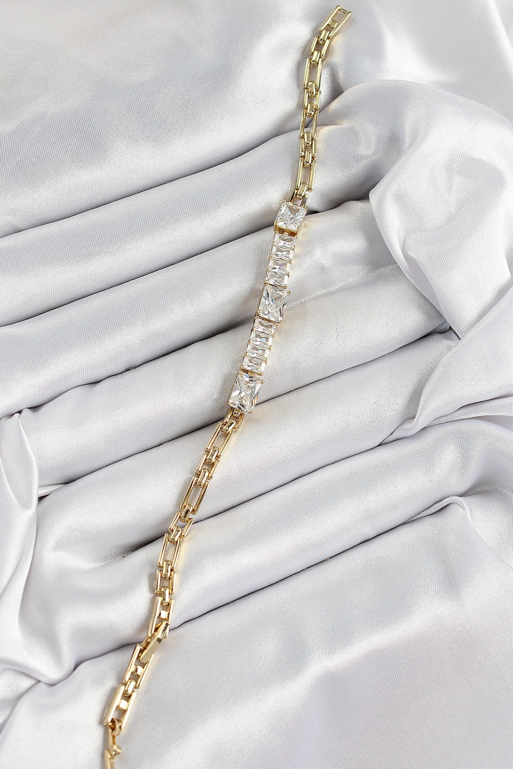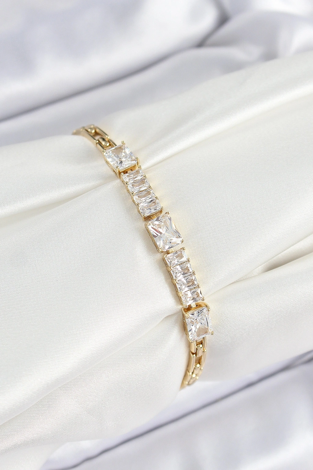 Gold Renk Zirkon Taşlı Sıralı Yonca Model Asansörlü Kadın Bileklik