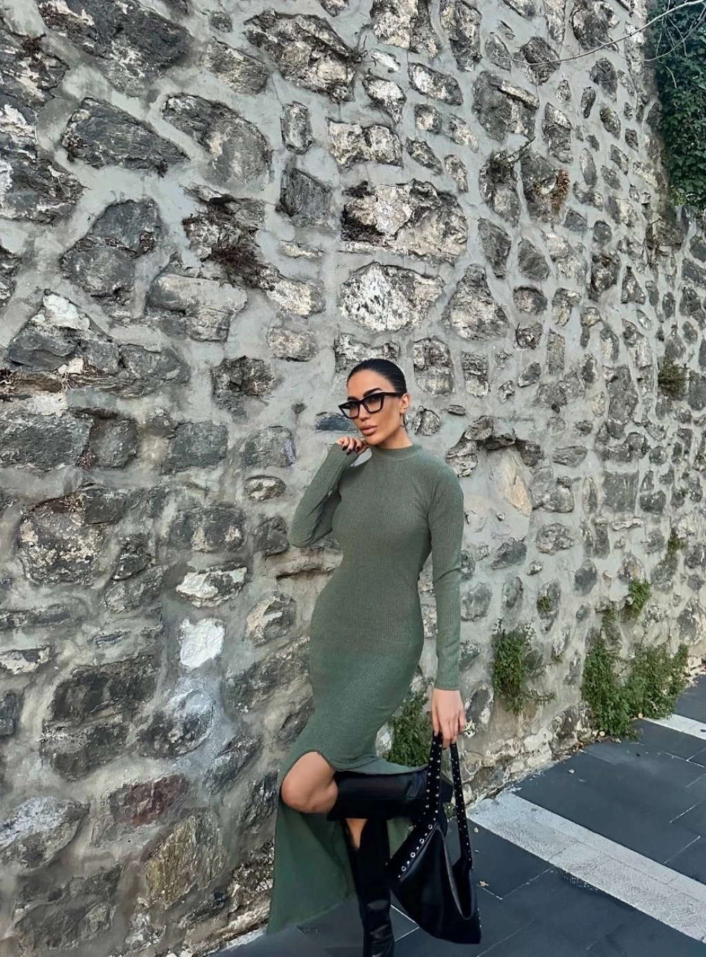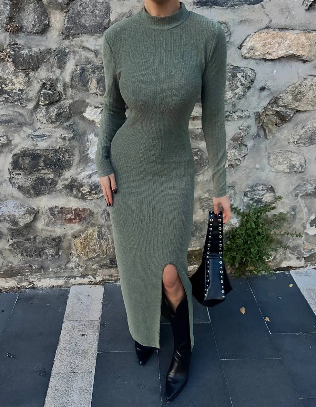 Yırtmaçlı kalın bürümcük uzun elbise Yeşil
