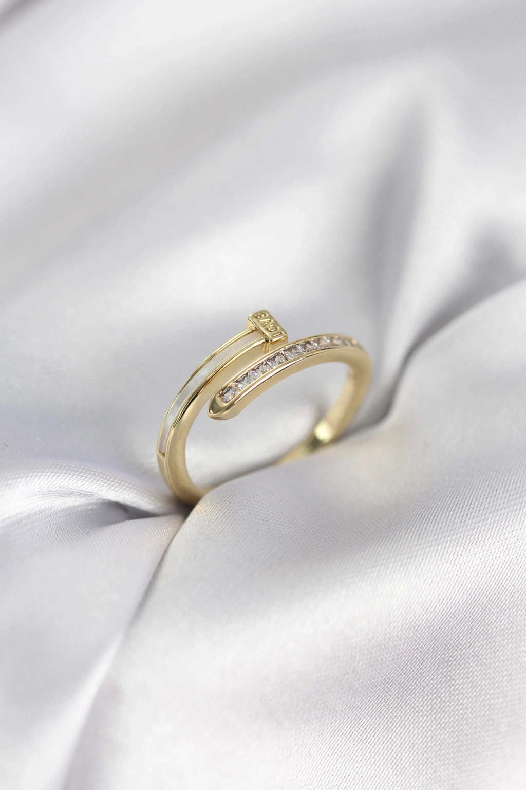 Zirkon Taşlı Gold Renk Yassı Çivi Model Kadın Yüzük